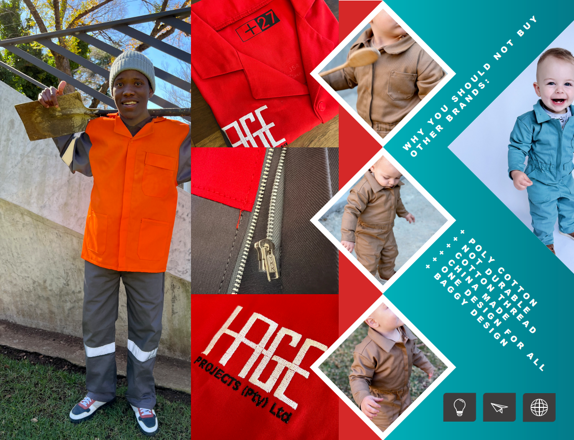 We specialise in custom designed proudly South African made work wear overalls. My husband has a construction company and he always complains about the poor quality of the overalls on the market. I have a sewing business so i decided to design a overall with durability using the ultimate design and fabric to ensure a longer life span.